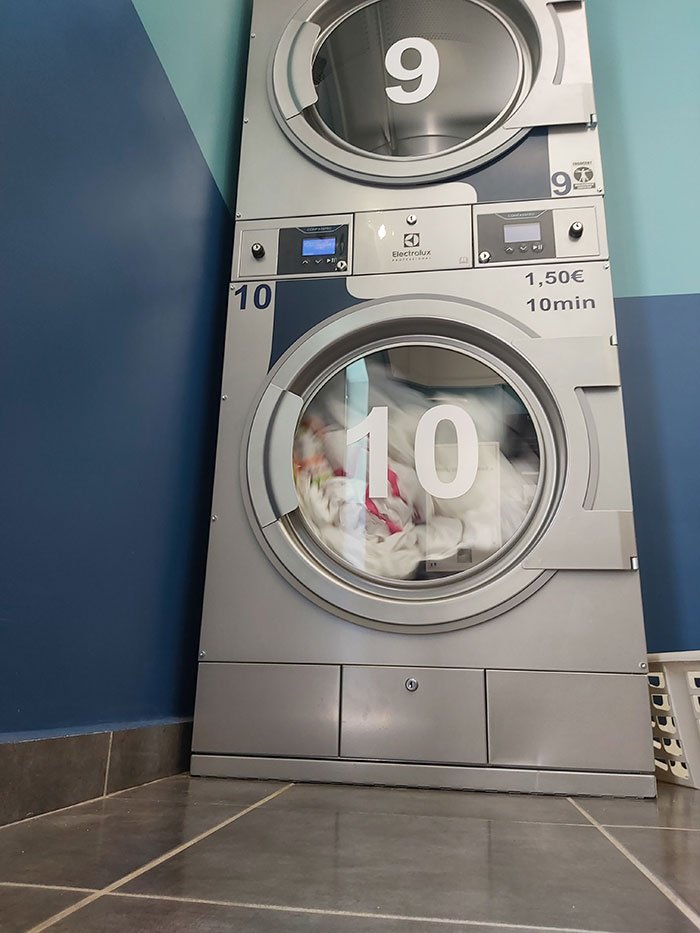Nos laveries sont équipées de machines à laver super essorage 1200 tr/min, pour une humidité résiduelle en fin de cycle de seulement 50 % alors que généralement, la majeure partie des laveries sont équipées de machines simples essorage 600 tours/min maximum avec un taux d’humidité résiduelle de 70 %.